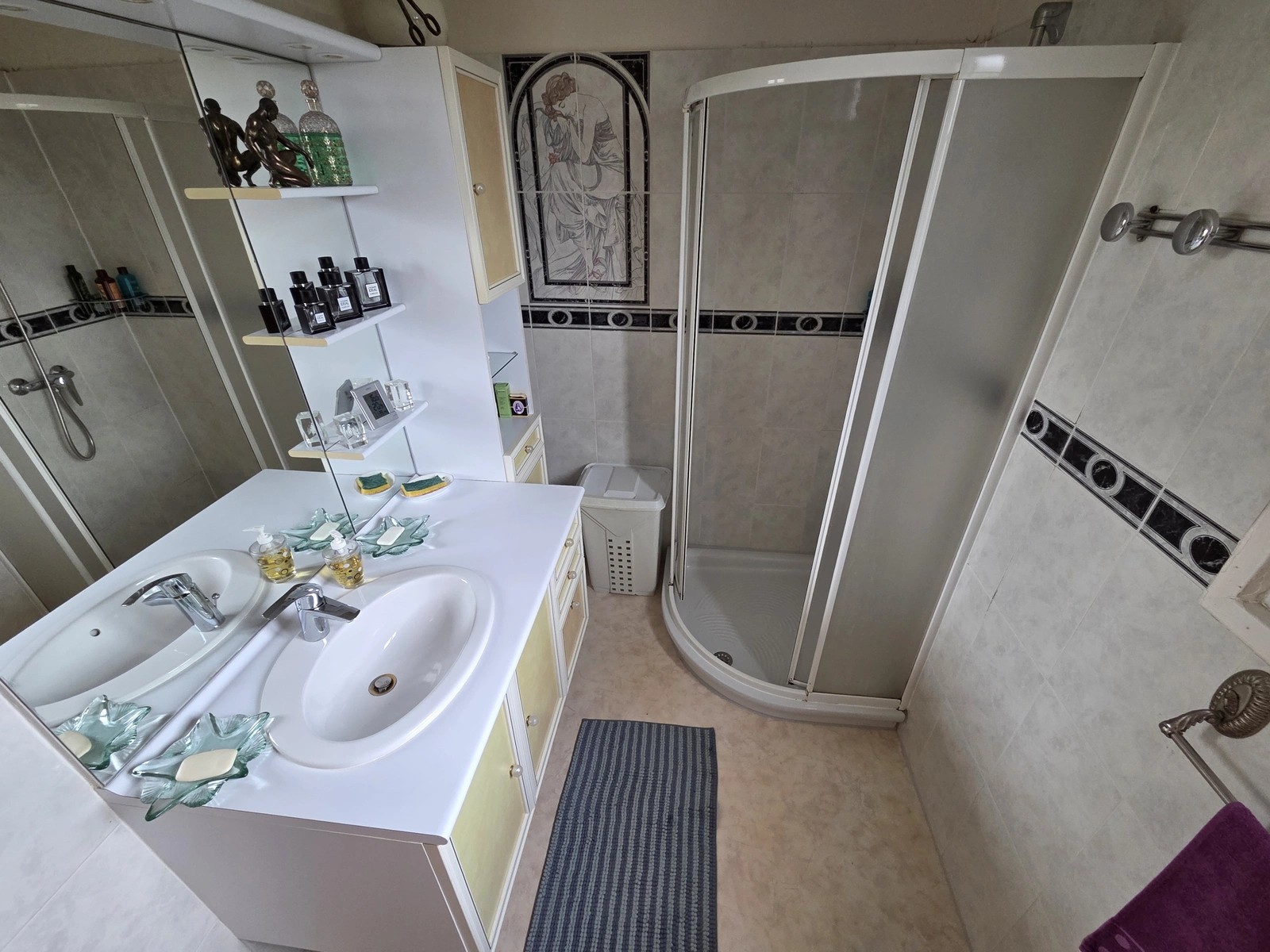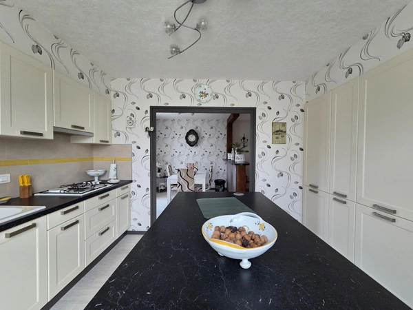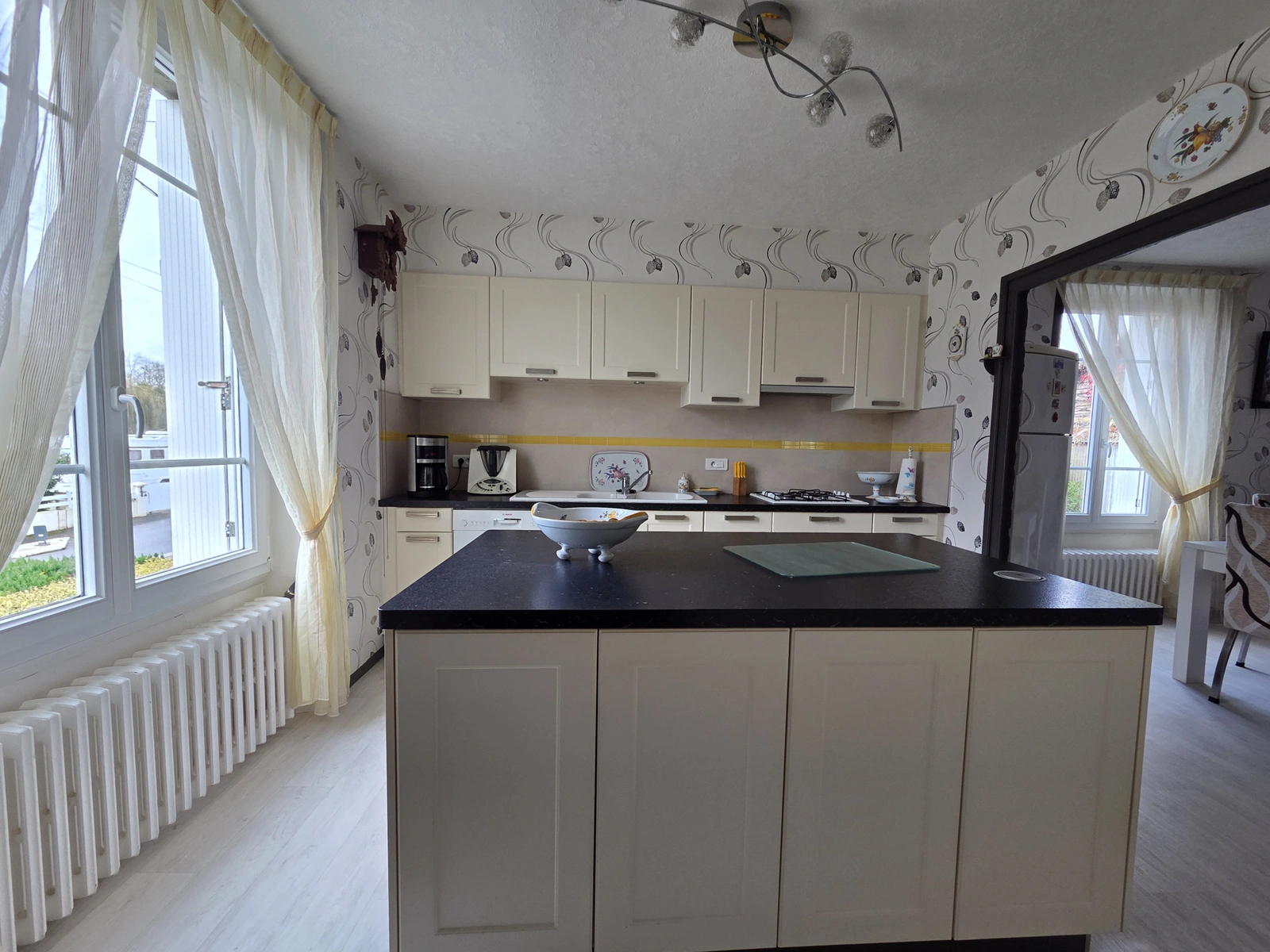 Le rez-de-chaussée surélevé s'ouvre sur un vaste salon-séjour lumineux, où le charme opère dès les premiers instants. La cuisine aménagée et entièrement équipée, ouverte sur la pièce de vie, séduit par son bel îlot central et son plan de travail spacieux, créant un espace convivial et contemporain, idéal pour partager de beaux moments en famille ou entre amis.